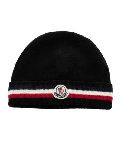 Black, multicolor knit Moncler beanie with embroidered logo patch at front. | Moncler Stripe Knit Beanie in Black/Blue