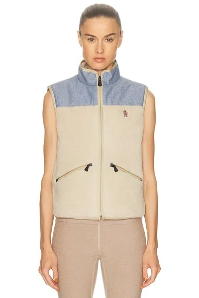 Moncler Grenoble Vest in Light Beige - Beige. Size M (also in ). Self: 54% acrylic 46% polyester Lining: 100% polyester Contrast Fabric: 81% cotton 19% polyester. Hand wash. Front zip closure. Front zip pockets. Front embroidered and back reflective logo. Contrast denim design at shoulders and collar. Midweight sherpa fabric. MOBF-WO74. L10988G0000289AGK. About the designer:
