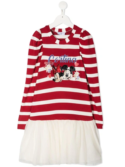 Monnalisa red layered dress with Disney print, striped detail, graphic print, round neckline, long sleeves and skater skirt. Viscose 91%, Polyamide 7%, Spandex / Elastane 2%