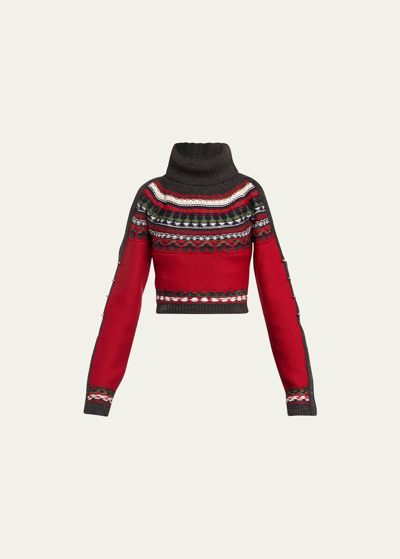 Monse Cropped Fairisle Slit Sleeve Turtleneck Sweater in Red & Charcoal - Red. Size M (also in XS, L). 100% extrafine merino wool. Made in Bulgaria. Dry clean only. Foldover neckline. Midweight knit fabric. Silver-tone safety pins at side seams. MNSF-WK60. MR240103FMR. About the designer: Inspired by confident, fearless women, Monse is a fresh take on modern femininity. Balanced by vibrant color palettes, exquisite fabrics and discreet finishes, the label expresses its effortless aesthetic through structural yet breezy silhouettes.