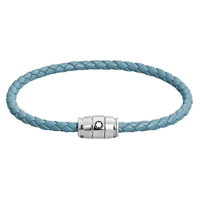 Montblanc Mens Bracelets. Meisterstuck series. SKU: MB134293. Color: Smoky Blue. Montblanc Meisterstuck Steel Smoky Blue Leather Bracelet. Woven from smoky blue leather, this bracelet features a polished stainless steel clasp accented with the Montblanc emblem, combining subtle elegance with modern craftsmanship.