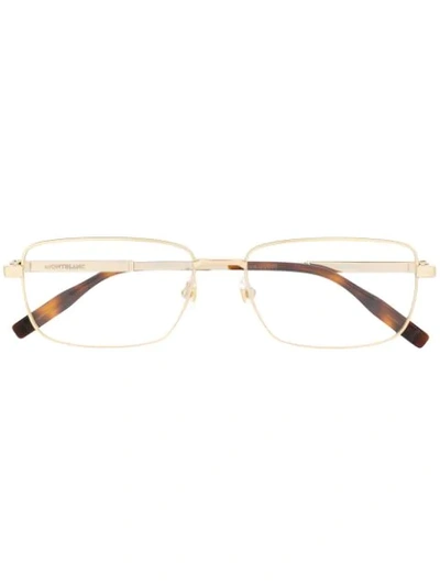Gold-tone and brown acetate and metal rectangular frame glasses from Montblanc featuring a logo at the temple, tortoiseshell detailing and straight arms with curved tips. This item comes with a protective case.