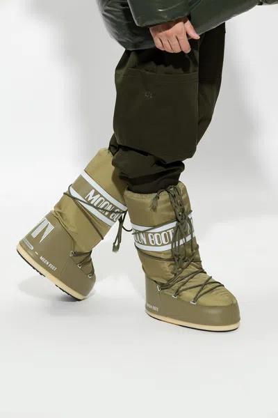Khaki ‘Icon Nylon’ snow boots from Moon Boot. This pair featuresdouble tie fastenings, logo print, silver-tone metal hardware andrubber sole in cream and black. Inspired by the peculiar shape andtechnology of the astronauts’ boots, the iconic style was designedin 1969 after the first Moon landing.