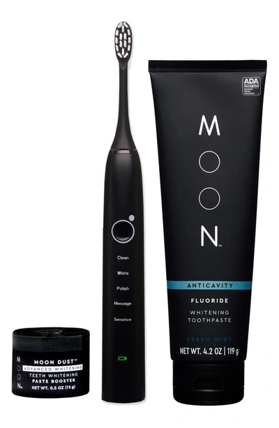 What it is: A set of three teeth-whitening essentials including MOON's waterproof electric toothbrush.Set includes:- The Electric Toothbrush in Onyx: a powerful yet gentle ergonomic and elegant toothbrush with five sonic cleansing modes and premium quality bristles- 2 Interchangeable Brush Heads in white and black: a pack of two brush-head replacements that pair with the toothbrush.- Moon Dust Teeth Whitening Paste Booster (0.5 oz.): a paste booster that acts like a polish for teeth, with kaolin and bentonite clays to help brush stains away and reveal a brighter, whiter smile, in a neutral flavor that blends seamlessly with the freshness of your normal toothpaste- Fresh Mint Cavity Protection with Flouride Whitening Toothpaste (4.2 oz.): a toothpaste that helps prevent cavities and has a refreshing mint flavor- Travel case- USB charging base