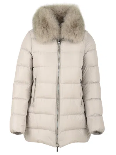 quilted boudin front closure with double-slider zipper front pockets removable genuine fox collar down proof and water repellent