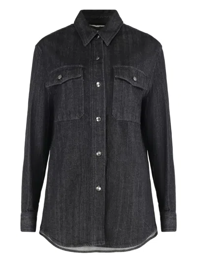 blue denim fabric button fastening long sleeves flap pockets collared neck
