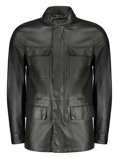 MOORER Four-pocket Drawstring Leather Jacket In Black