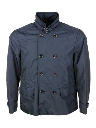 Jacket made of water-repellent taffeta gabardine, a fine technical fabric. front closure with hidden zip and horn buttons. internal drawstring