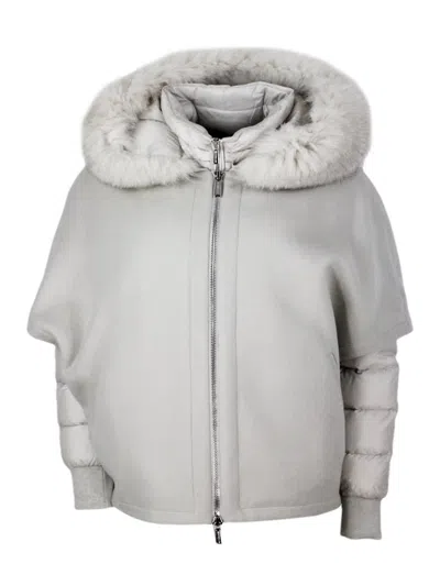 3-in-one jacket composed of: inner duvet in real feathers and outer cape with hood in pure cashmere and fox fur trim