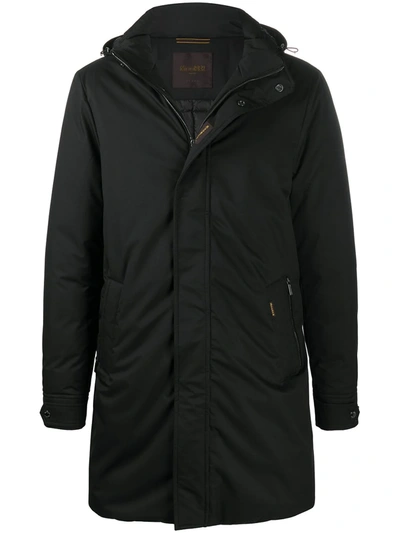 Black feather down padded hooded parka from MOORER featuring padded design, two side zip-fastening pockets, two side inset pockets, concealed front zip fastening, long sleeves and classic hood.