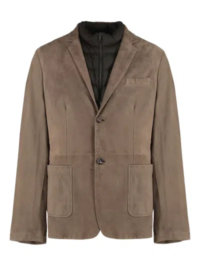 Removable inner waistcoat lapel collar two front pockets and chest pocket buttoned cuffs back slit hem padding: 100% goose down 100% leather, 5% polyurethane, 95% polyamide Composition: 100% % Leather, 5% % Polyurethane, 95% % Polyamide