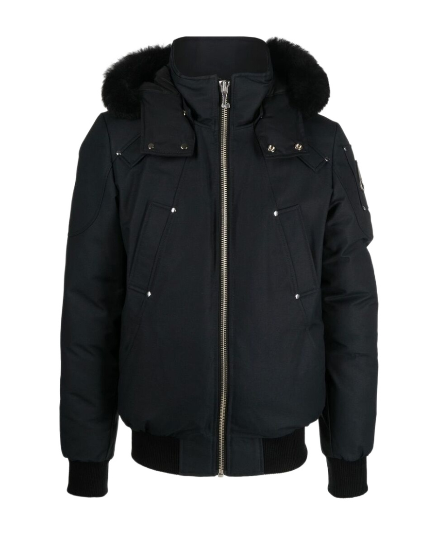 Original Ballistic bomber jacket from MOOSE KNUCKLES featuring black, cotton blend, insulated design, down-feather filling, silver-tone logo plaque, drawstring hem, front zip fastening, two diagonal pockets to the sides, two chest welt pockets, ribbed cuffs, ribbed hem, long sleeves and straight hem.