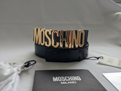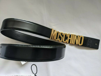 LAST ONE AVAILABLE! *Same Day Expedited Shipping* MOSCHINO COUTURE SHINY BLACK LEATHER BELT WITH GOLD LETTERING LOGO Limited and Hard to Find - completely SOLD OUT! 100% Authentic!!! Condition: Brand new with tags attached, original Moschino dust bag included (box and authenticity card may or may not be included) Pattern: Logo Style: Casual Material: Calfleather Height: 35 mm / 1.3 inches Size: Please use the drop down menu to choose your desired size Please refer to info below regarding Moschino belts sizing MADE IN ITALY Color: Gold, Black Gold Tone Hardware Adjustable pin closure Moschino Logo *Please note the gold copper might have few marks/blemishes on it Each Belt has 5 holes to adjust the circumference (each hole is 1" apart) LENGTH MEASUREMENTS Size 38 - Length between 27" (smallest option on the first hole) until 31" longest option (5th hole). Size 40 - Length between 29" (smallest option on the first hole) until 33" longest option (5th hole). Size 42 - Length between 31" (smallest option on the f