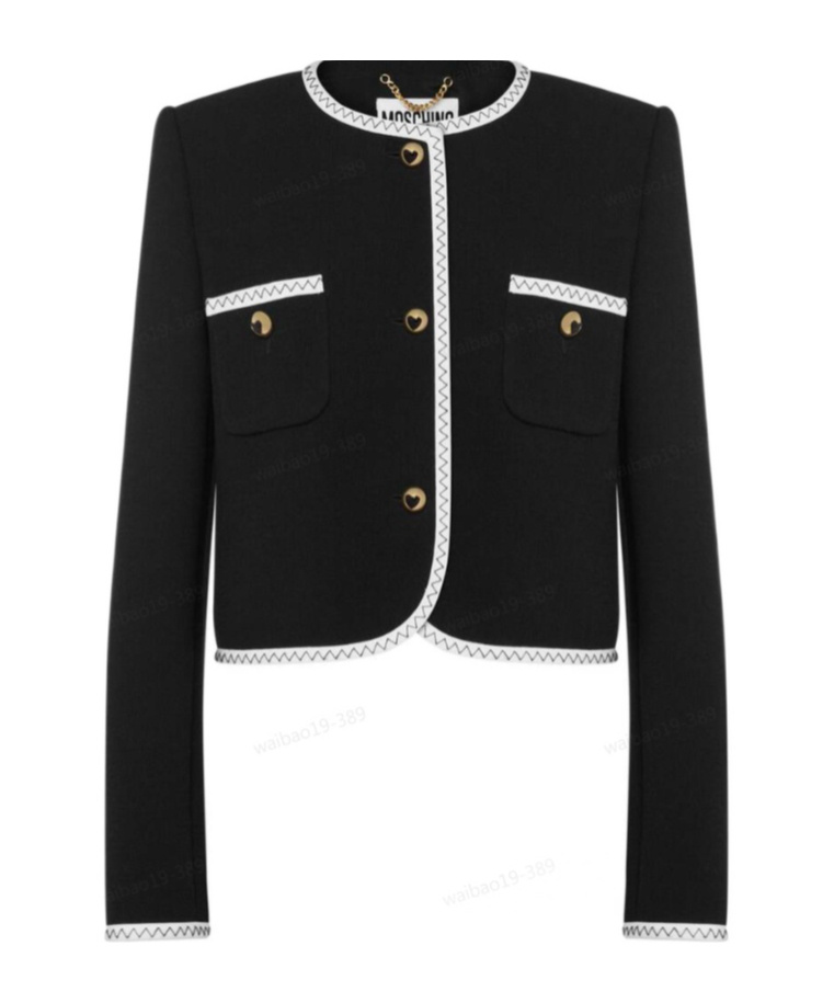 Moschino presents this short jacket crafted from a premium crepe viscose blend. The structured silhouette features padded shoulders and long sleeves, complemented by a refined button closure and two front pockets. Contrasting grosgrain trims accentuate its tailored appearance, making it an emblem of modern sophistication. 58% viscose, 40% wool, 2% elastane True to Size Made in Italy
