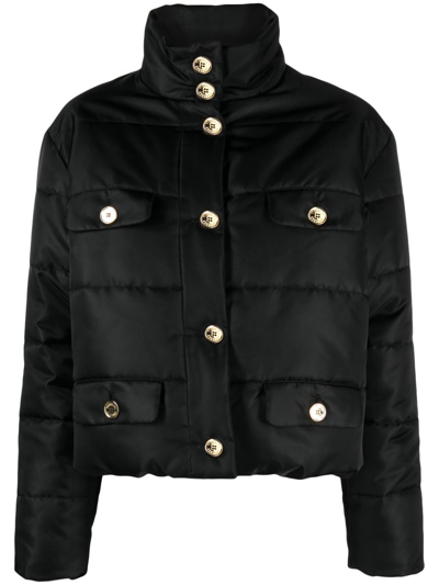 This stylish padded down jacket features a high collar and a flattering cropped silhouette. The front closure is adorned with gold logo buttons, while two chest pockets and a quilted design enhance its appeal. This piece combines warmth and comfort, making it an essential outerwear item. Expertly made in Italy, it exemplifies luxury and sophistication, perfect for any chic wardrobe.- Padded down jacket- High collar- Cropped silhouette- Gold logo button closure- Two chest pockets- Quilted design- Made in Italy