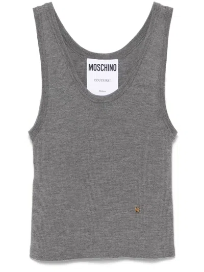 slate grey virgin wool ribbed knit logo lettering scoop neck sleeveless straight hem