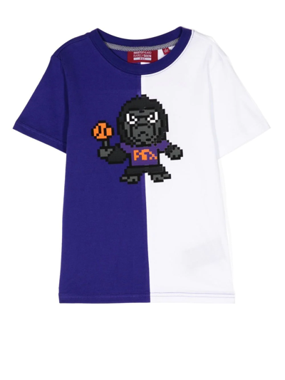 Mini Pheonix Split T-shirt from Mostly Heard Rarely Seen 8-Bit featuring white, purple, multicolour, cotton, jersey knit, two-tone design, pixelated print, text print, number print to the rear, logo tag, crew neck, short sleeves and straight hem.