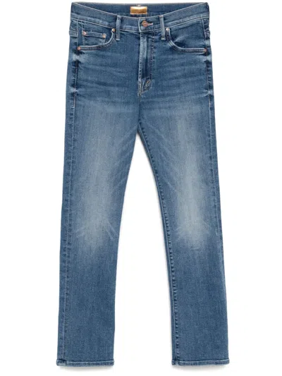 Blue concealed fly and button fastening belt loops classic five pockets whiskering effect at the thighs