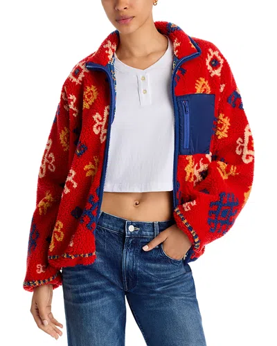 It's showtime. A cozy fleece jacket with a high neck, drop shoulders, zip pockets and curved hems. Designed in red, Sing For Your Supper features a folk art-inspired graphic print with blue trim and details. Imported. Style No. 31556-1618-SGF The Heat Lamp - Sing For Your Supper