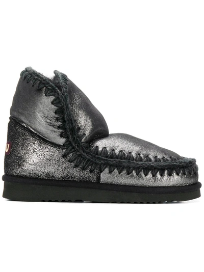 Metallic black shearling and sheepskin Eskimo boots from Mou featuring a round toe, a flat sole, an ankle length, whipstitch detailing and a rear logo patch.