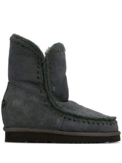 Grey sheepskin Inner Wedge boots from Mou featuring a round toe, a high ankle, a shearling lining and a flat rubber sole.
