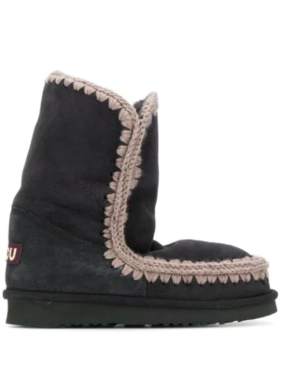 Black and light brown sheep skin and rubber lined interior ankle boots from Mou featuring a flat heel, a round toe, a slip-on style and an ankle length.