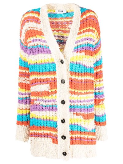 Multicolour cotton blend striped chunky knit cardigan from MSGM featuring chunky knit, horizontal stripe pattern, front button fastening, V-neck, long sleeves, ribbed hem, ribbed cuffs and unfinished effect.