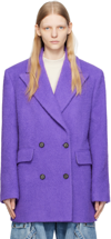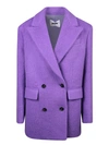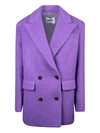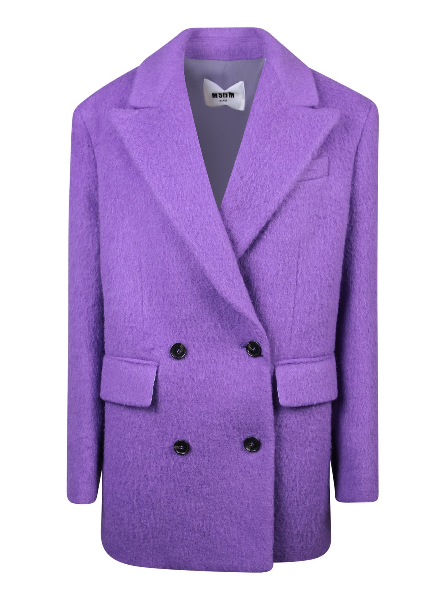 double-breasted felted coat from MSGM featuring plum purple, virgin wool blend, felted, notched lapels, double-breasted button fastening, long sleeves, two front flap pockets, chest welt pocket and straight hem.