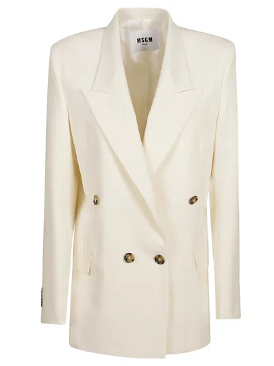 light beige virgin wool blend peak lapels shoulder pads long sleeves with faux buttoned cuffs chest welt pocket two front flap pockets straight hem logo-jacquard lining double-breasted button fastening