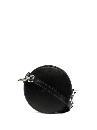 Black calf leather blend logo-embossed circular mini bag from MSGM featuring embossed logo to the front, silver-tone hardware, circular body, top zip fastening and adjustable detachable shoulder strap.