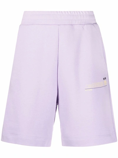 Lilac organic cotton logo patch track shorts from MSGM featuring logo print to the front, logo patch to the rear, elasticated waistband, two side inset pockets, rear patch pocket and knee-length.