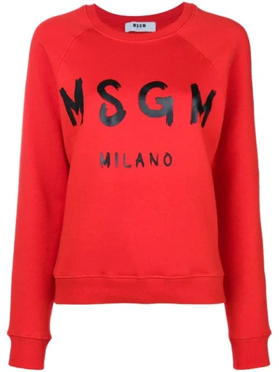 Red cotton logo print sweatshirt from MSGM featuring a round neck, long sleeves, a printed logo to the front and a ribbed hem and cuffs.