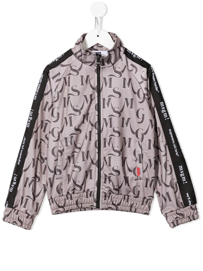 Mud brown logo-print track jacket from MSGM Kids featuring all-over logo print, logo-tape detailing, front zip fastening, high neck, elasticated trim, two front welt pockets and straight hem.