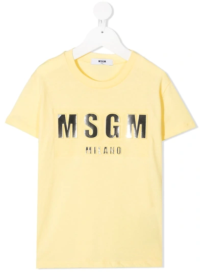 Canary yellow cotton logo print T-shirt from MSGM KIDS featuring logo print to the front, round neck, short sleeves and straight hem.