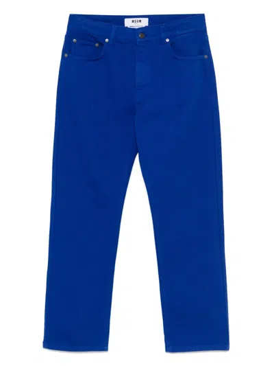 royal blue front button and zip fastening belt loops classic five pockets logo patch to the rear