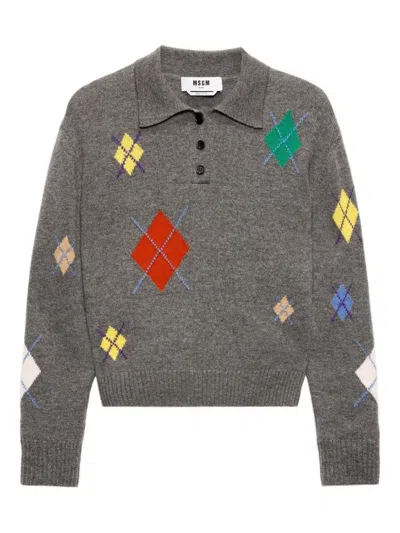 MSGM Polo Shirt With Argyle Pattern In Gray