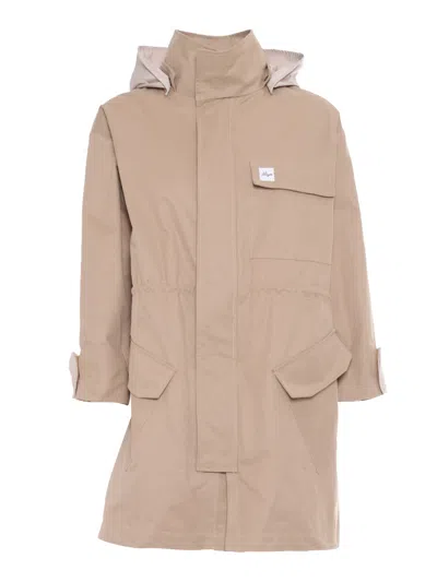 sand beige front press-stud and zip fastening detachable hood internal drawstring fastening waist two front flap pockets
