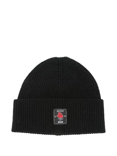 MSGM Rose-patch Ribbed Beanie Accessories In Black