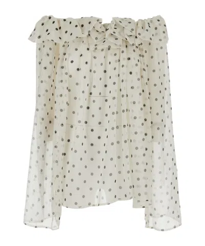 Adorned with an all-over polka-dot pattern. Features a center-back zipper design.