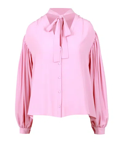 - Acetate - Solid color - V-neck - Button-down pattern - Wide long sleeves with cuffs - Bow ribbon on neck - Model is 5'7" tall and wears a 40