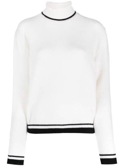 stripe-edge wool-blend jumper from MSGM featuring white/black, wool-cashmere blend, knitted construction, striped edge, ribbed trim, embroidered logo to the front, roll neck, long sleeves and straight hem.