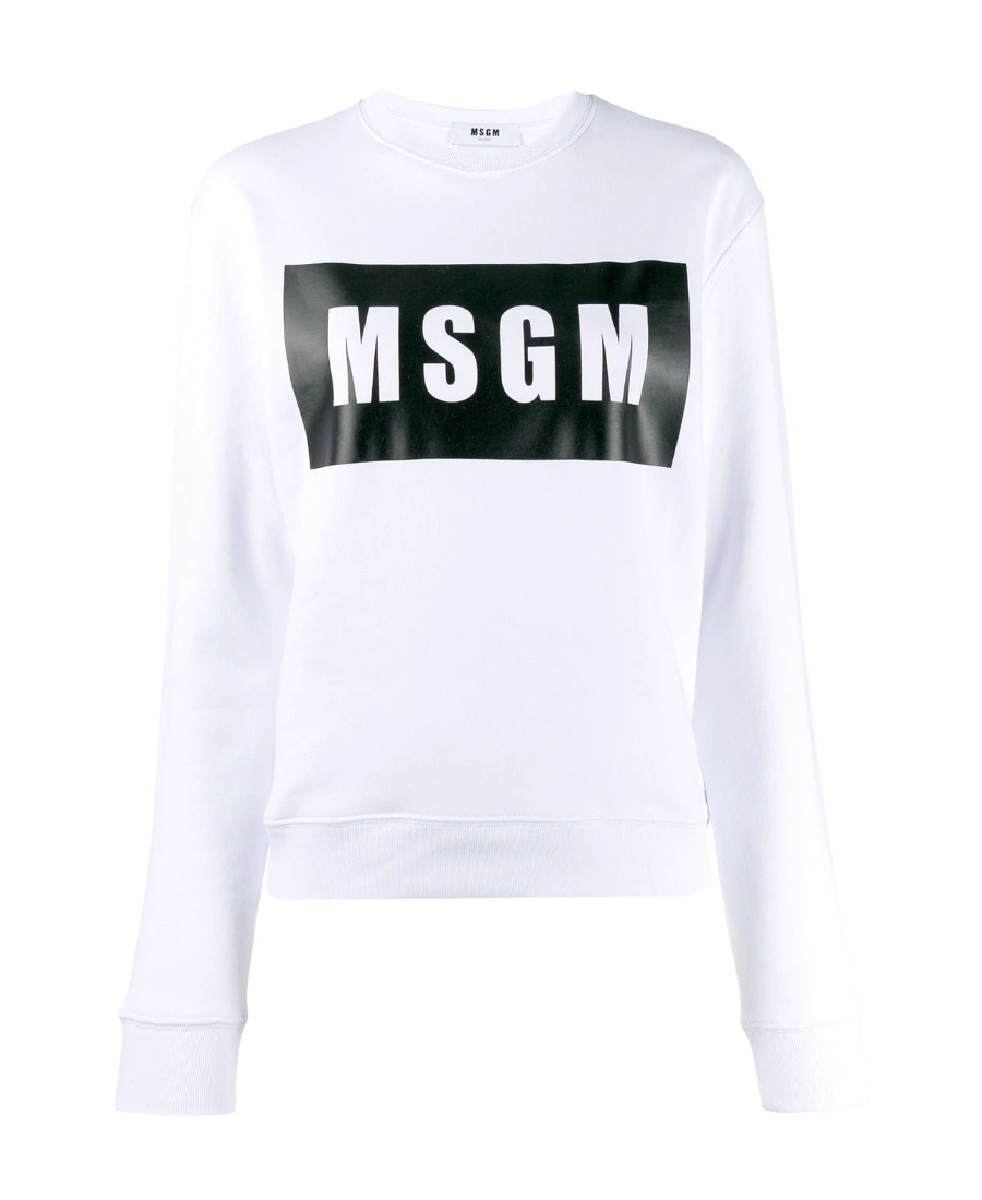 White/black cotton box logo crew neck sweatshirt from MSGM featuring signature box logo, crew neck, long sleeves, ribbed hem and ribbed cuffs.