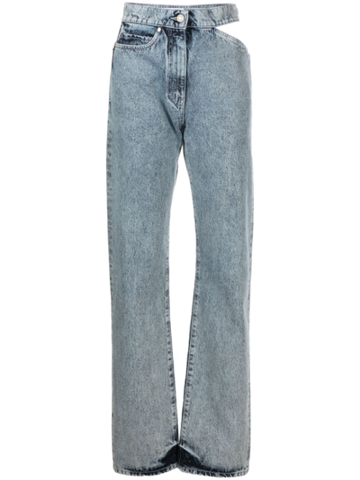 cut-out straight-leg jeans from MSGM featuring light blue, cotton, denim, logo patch to the rear, cut-out detailing, front button fastening, slip pockets to the sides, two rear patch pockets and straight leg.