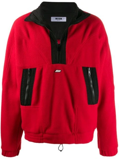 Red cotton blend half zip logo fleece from MSGM featuring a high standing collar, a front zip fastening, stitched panels, a front logo plaque, front zipped pockets, a relaxed fit, an elasticated hem, long sleeves and elasticated cuffs.