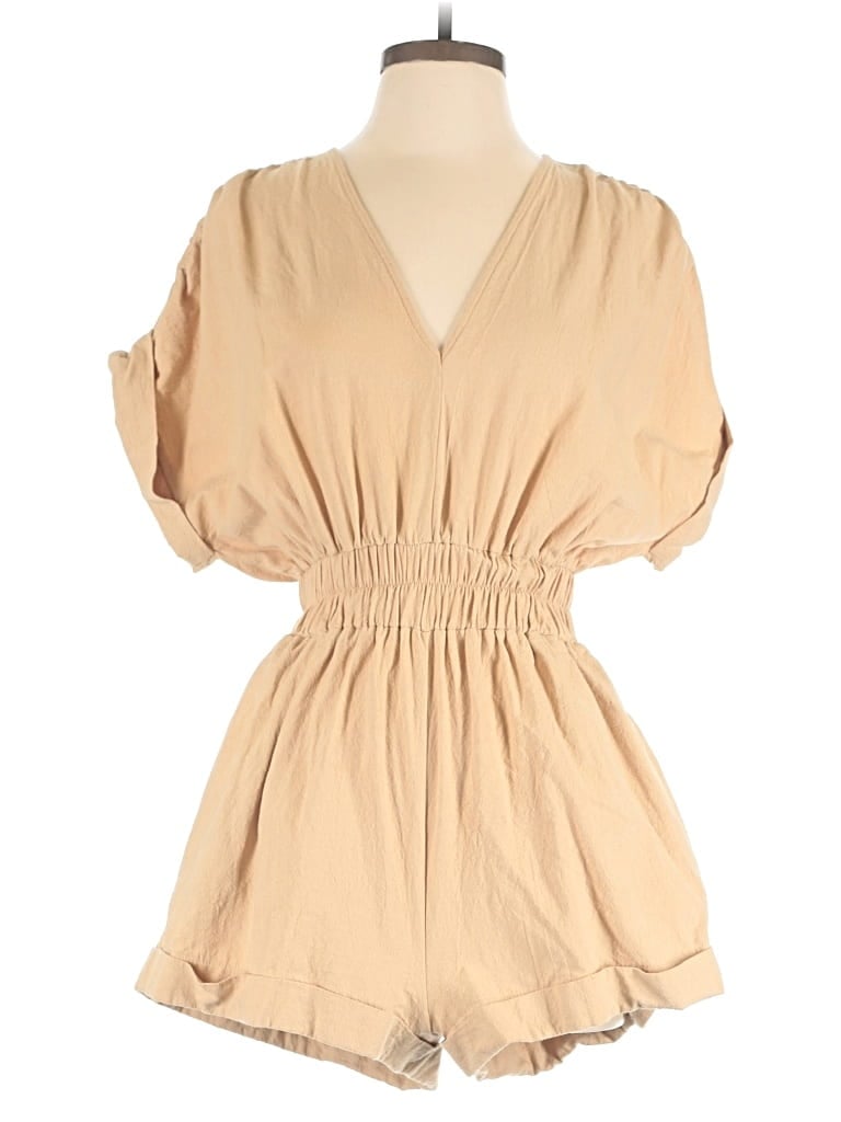 Mustard Seed Romper, Size: Small. Item Details: Tan, Solid Pattern, V Neck, Wide Leg, Short Sleeve, Ruched, Women's Dresses, 100% Cotton