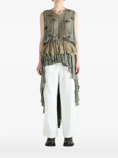 taupe brown v-neck ruffled detail high-low hem