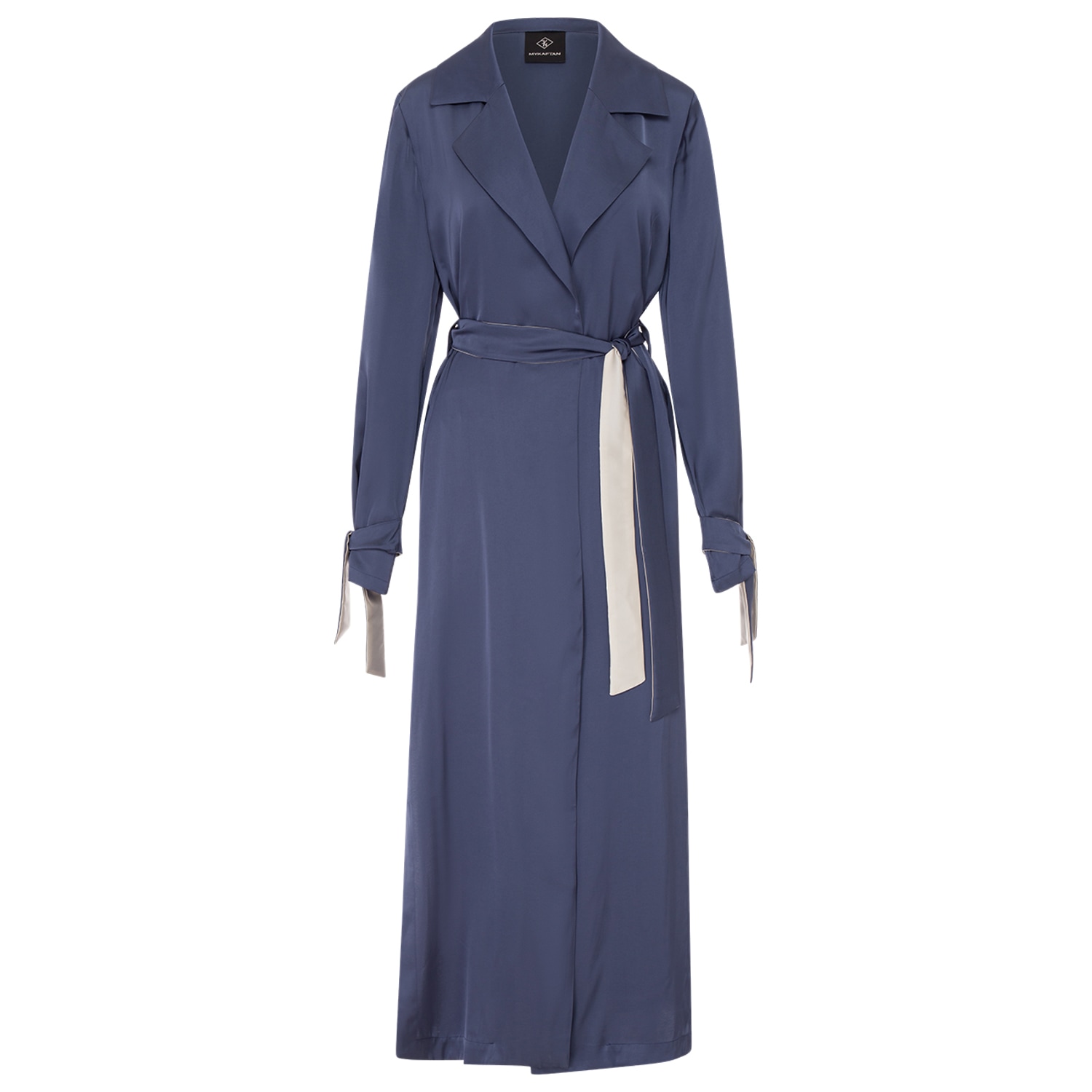 Introducing the Trench-Kaftan by MYKAFTAN, a revolutionary creation that fuses Western trench coat aesthetics with an Eastern touch in its intricate details. This unique piece showcases a relaxed silhouette, tied cuffs, and our distinctive metallic label gracing the back. For a seamlessly coordinated ensemble, pair it with the V-Neck Slip Dress in the corresponding Space Blue shade from the same collection. Crafted from lightweight satin, the Trench-Kaftan features a double-sided belt and cuffs in a complementary Ivory Shade, offering a stylish contrast to the overall look. Complete with sewed-in pockets for added convenience, this limited edition garment ensures a harmonious blend of fashion-forward style and practical sophistication for your special occasions. 100% Viscose. Delicate hand wash or dry cleaning Made in Dubai