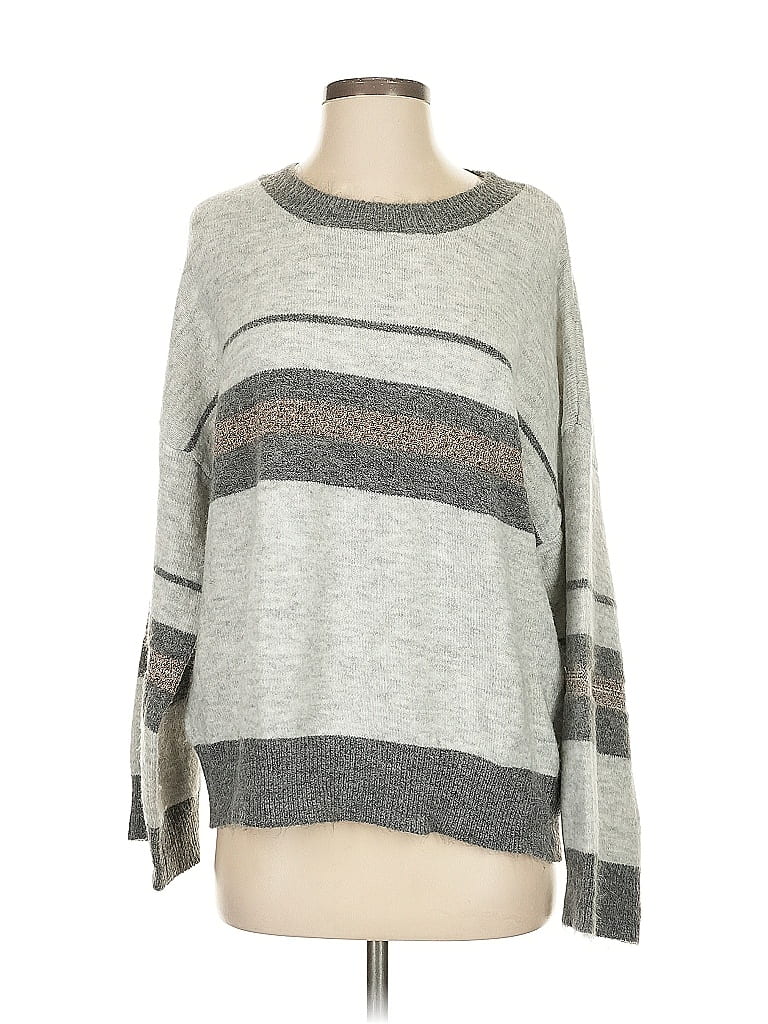 Mystree Pullover Sweater, Size: Small. Item Details: Gray, Stripes Pattern, Boatneck, 3/4 Sleeve, Women's Tops, Spandex/Polyester/Acrylic