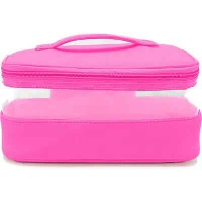 A spacious cosmetics case designed with a carry handle and clear panel will keep your cosmetics secure on the go. 4.3"H x 5"W x 9"L Top pull handle Zip-around closure Neoprene/PVC/polyester Spot clean Imported