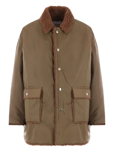 Mythinks' oversize jacket crafted in green nylon with brown teddy trims and intern. Featuring classic collar, snap-button closure, long sleeves, front pockets and straight hem.